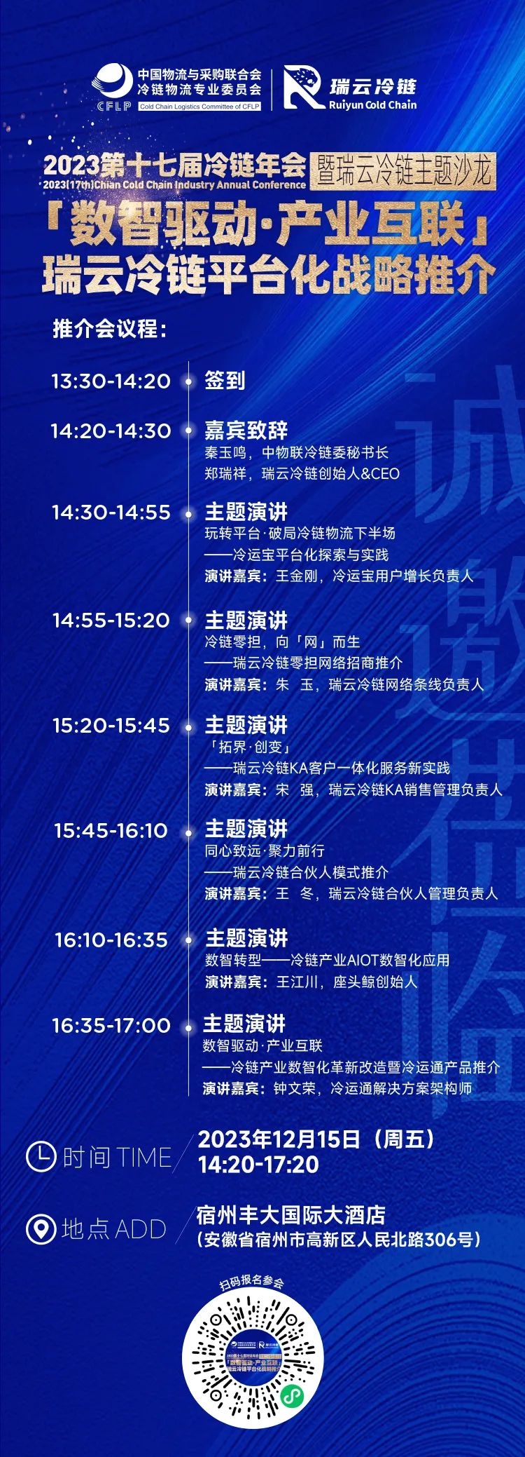 12月15-17日,由中國物流與采購聯(lián)合會主辦,中國物流與采購聯(lián)合會冷鏈物流專業(yè)委員會承辦的“2023第十七屆中國冷鏈產(chǎn)業(yè)年會”將在安徽宿州舉辦。
