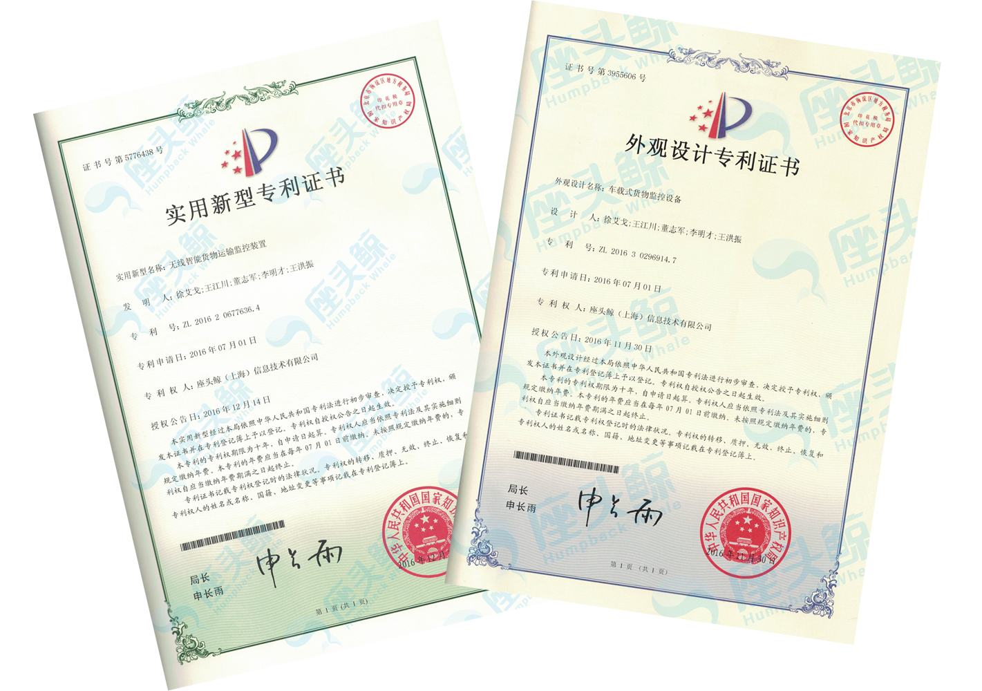 座頭鯨公司的鯨貨物保鏢系列產品,獲得了國家知識產權局核準頒發的《實用新型專利證書》;鯨貨物保鏢-分體式車載版,獲得了《外觀設計專利證書》。