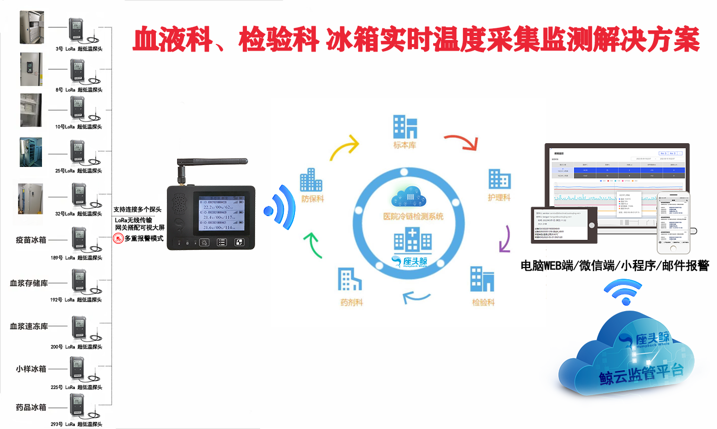 血液是人體內不可缺少的元素,它有著很多的功能,最主要的是運輸功能,運輸氧氣、二氧化碳、水分和營養物質,身體所需要的各種營養物質都是通過血液來輸送搞各個臟腑器官的,而且血液還可以維持身體各臟腑器官的平衡,維持內環境溫度,維持正常體溫。血液中的一些成分可以清除體內毒素和殺滅細菌,抵制外界病原微生物和各種細菌的侵入,對身體有著免疫作用,當身體受到傷害的時候還可以發揮止血作用。隨著現代醫學的高度發展,人類的壽命不斷延長,但疾病從不缺席,同時意外事件頻發,導致社會對于血液的需求量也不斷的攀升。血液的儲存需要在冷鏈的條件下進行,座頭鯨醫院血液儲存溫濕度以及采樣冰箱監控解決方案旨在監測醫院,疾控中心,社區醫院血庫、血液科、檢驗科的冰箱,冰柜溫度保證血液、檢測樣本等存儲安全。加強血液冷鏈完整性、保證血液質量極為重要。在保證血液質量的同時,也關系到臨床輸血的療效,減少輸血反應的發生,保證臨床安全輸血。